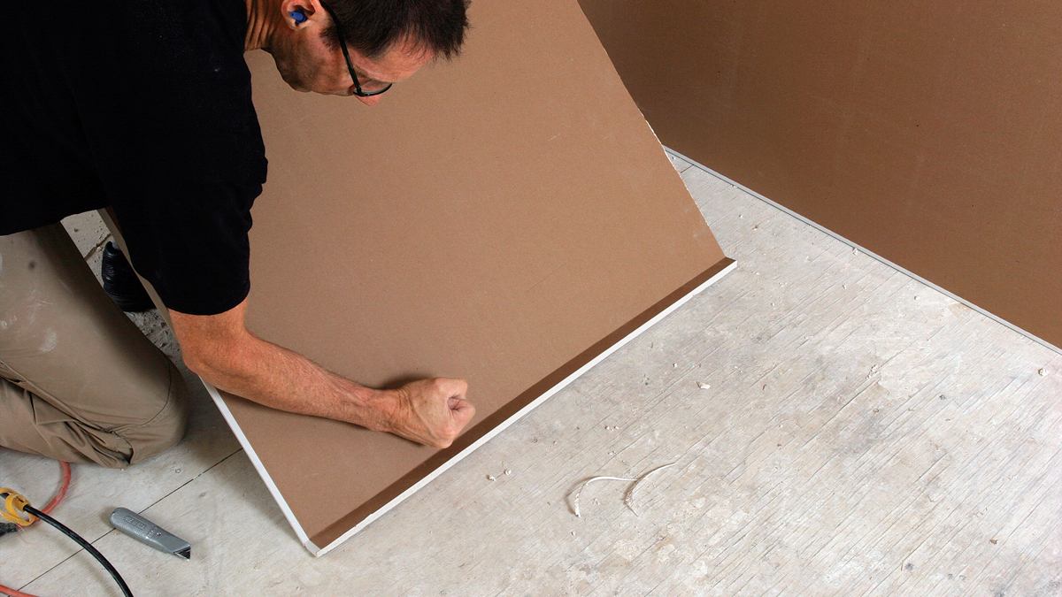 If the edges of the piece you’re cutting won’t be parallel—for example, an angle to fit below a stair or because a ceiling’s width varies—snap a chalkline and cut along it.