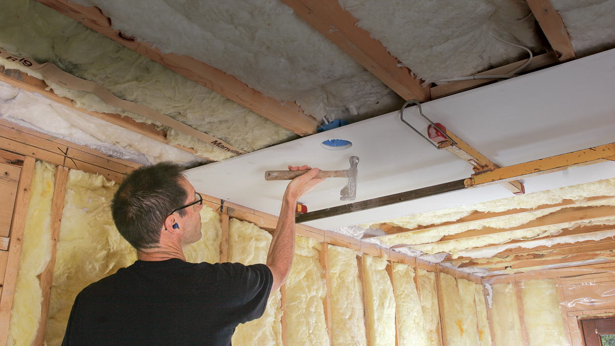 1. It’s faster and more accurate to cut out for electrical boxes, lights, or fans with the drywall tacked in place. Make sure the wires are pushed toward the back of the box so that they won’t be damaged by the saw or the router bit, and don’t fasten right next to the penetration until after you cut. You can make the cuts with a drywall saw, but pros use a drywall router. Routers are faster and leave a cleaner edge than a drywall saw. The downside is that they create more dust. Still, if you’re going to hang drywall in anything more than a room or two, it’s worth the $60 to buy a router.