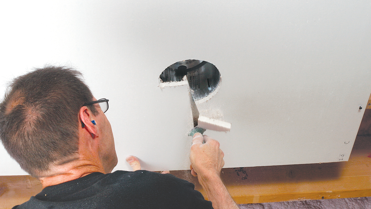 4. With the hole fully cut, a light hammer tap causes the dust to fall out so that it won’t interfere during taping.