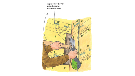 A piece of bevel wood siding pushes housewrap tightly into the corner without tearing.