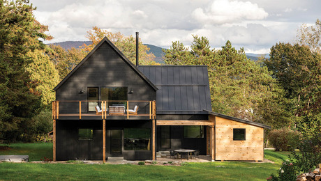 Scandanavian FarmhouseA wide overhang with a blend of natural pine and burnt wood frames the front porch of this not-so-typical Vermont farmhouse.