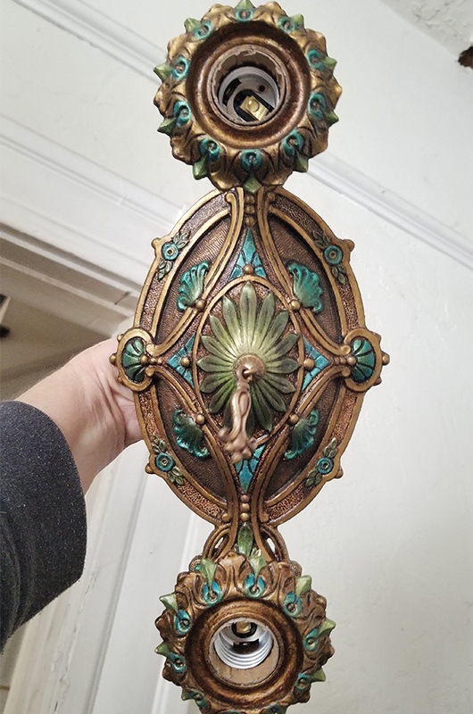 Finished: after stripping away layers of paint on a cast-aluminum ceiling fixture, the author created her own period-inspired color scheme using acrylic paints and metallic wax in a process that required many steps and retouching.