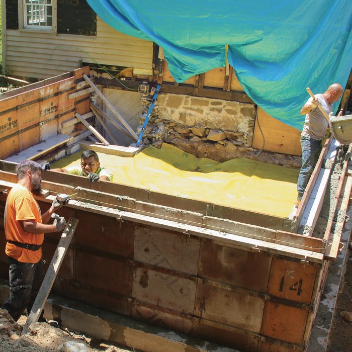 Even though a full basement is only a little more money in a situation like this, we opted for shorter crawlspace walls over a full-height basement to minimize excavation close to the existing stone foundation to prevent undermining it. We like crawlspaces under kitchen additions because they make future changes and upgrades easier compared to slab-on-grade or pier-and-beam foundations.