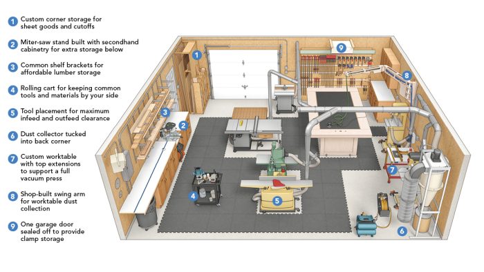 A custom finish carpenter shares how he designed and outfit his two-car garage shop with all the tools, jigs, and accessories he needs to comfortably do great work.