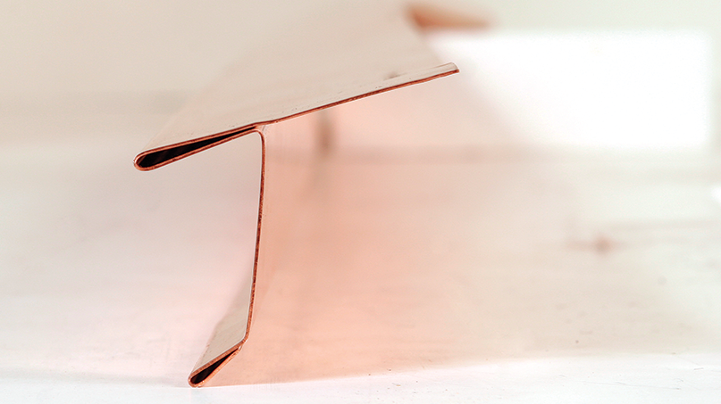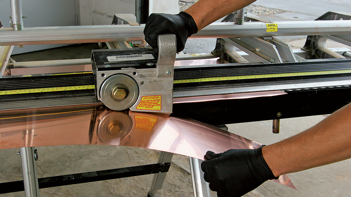 When you’re using a brake, it’s a good idea to use a piece of scrap for a mock-up to ensure that all the bends can be made in sequence. For drip-edge flashing, I cut a 6-in.-wide piece. I fold the hem and kickout first, then work my way back. I wear gloves to protect my fingers and also to prevent fingerprints that would tarnish the copper. While the measurements here create a standard drip edge, a brake allows me to customize the profile if I need to.